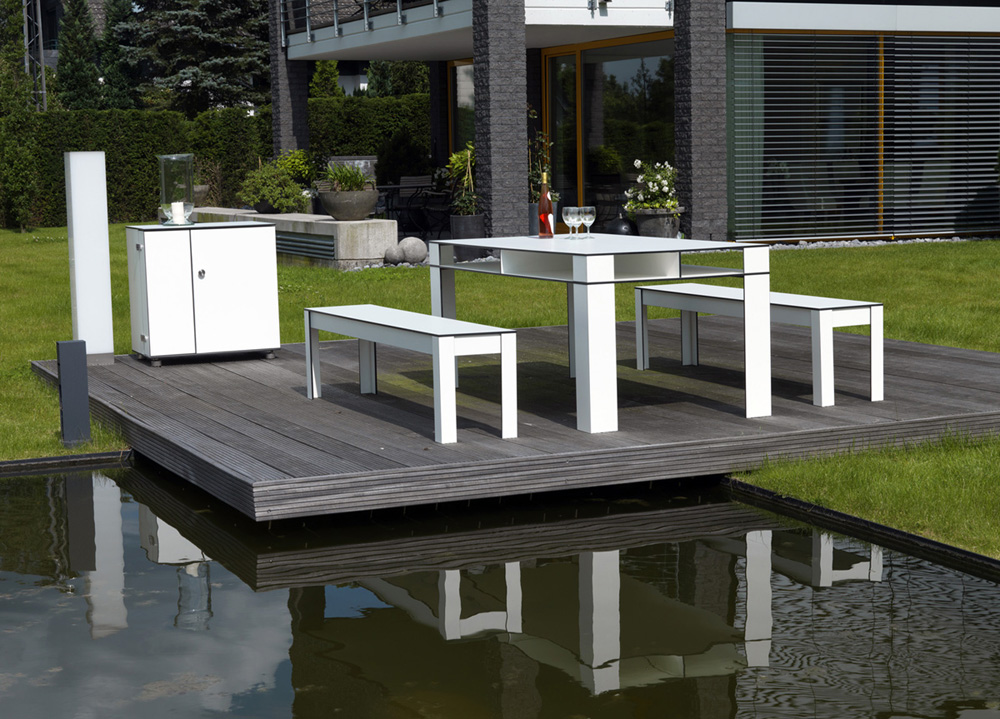 The design of this modern garden table is holistic and strong. This intentionally stands in contrast with the minimal thickness of the construction material used. The coloured core / edges of the material underlines the contratst with the colour of the decor (black core / edges with decors "white" and "mid grey", brown core / edges with other decors).