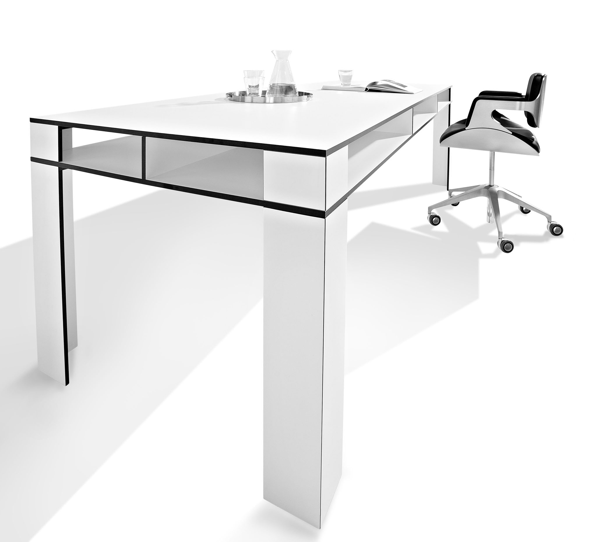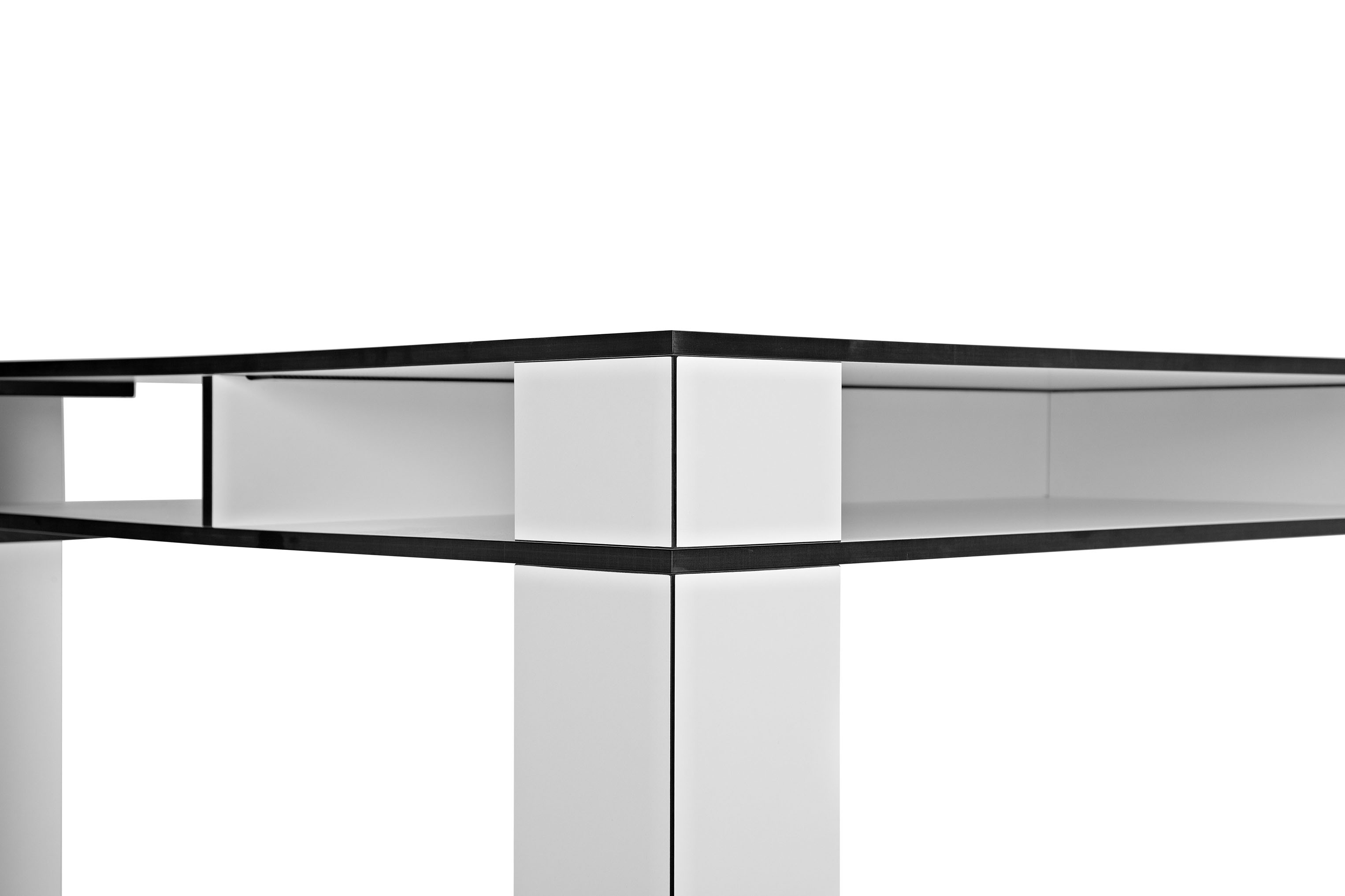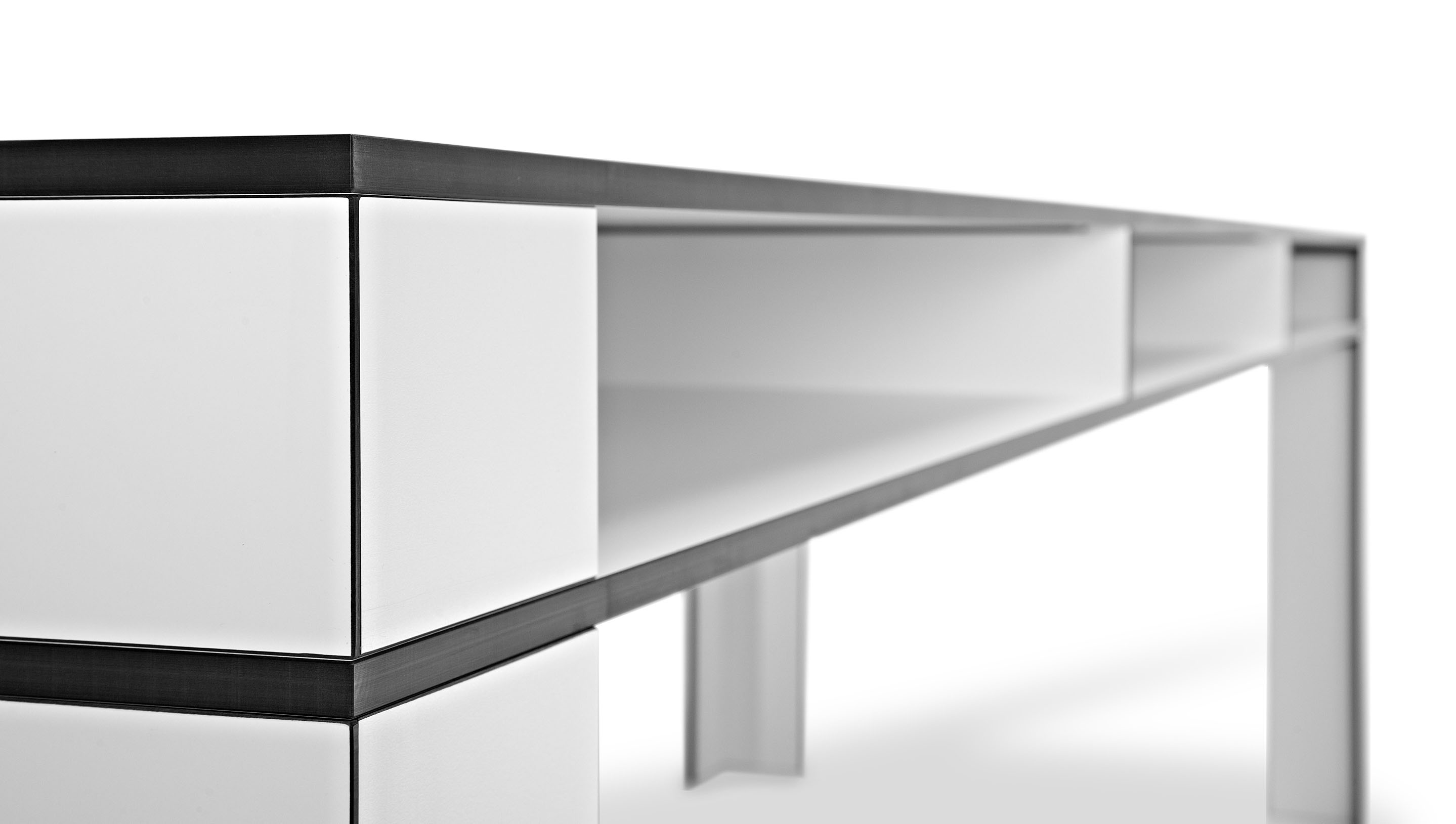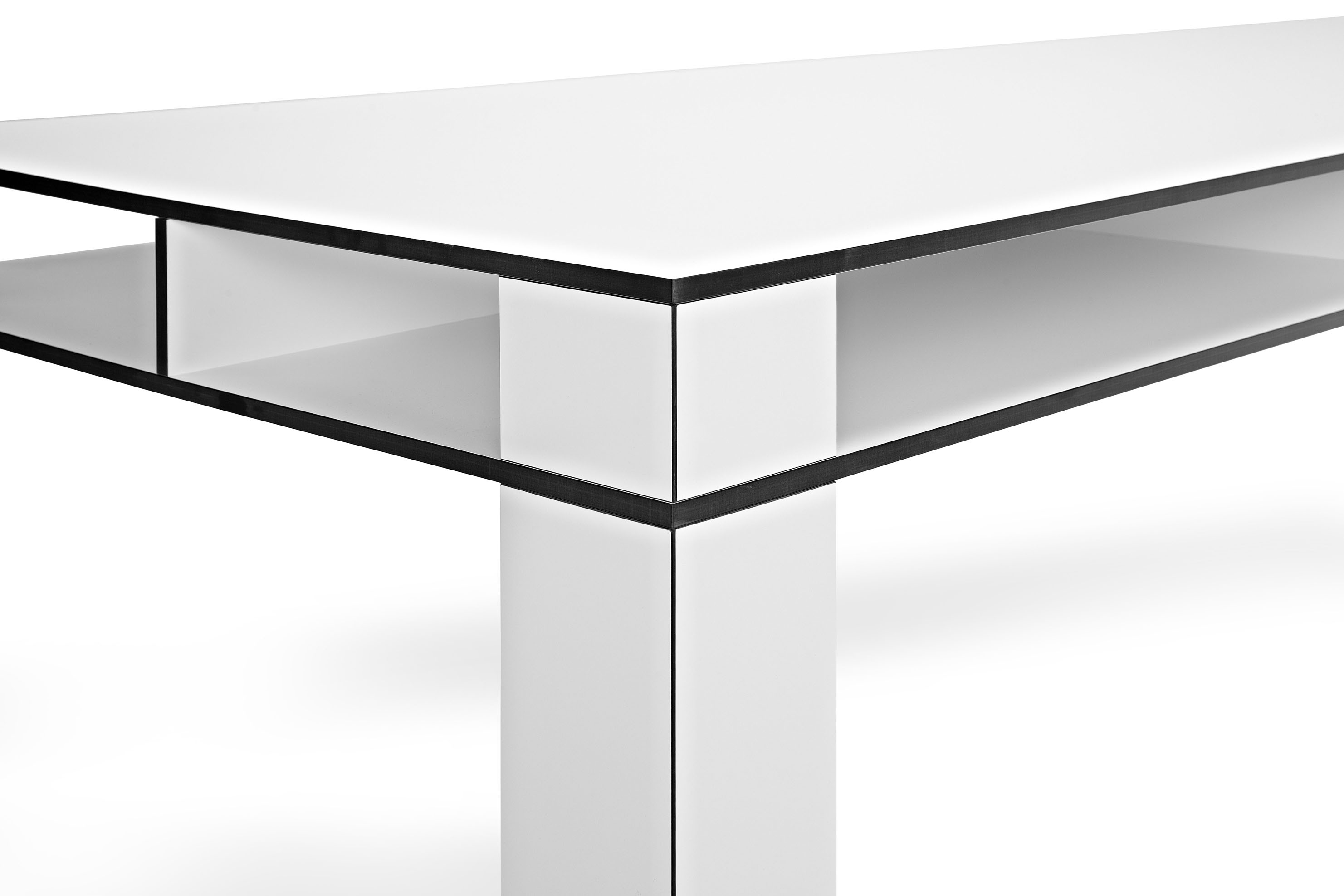 Das Design des Tisches wird durch ein ganzheitlich kräftiges Auftreten geprägt. Dieses steht bewusst im Kontrast zur minimierten Materialstärke von nur 1,3 cm. Die Kanten setzen einen starken Akzent, der sich aus dem Kontrast des Dekors und der Kernfarbe des Materials HPL ergibt (schwarzer Kern / schwarze Kante bei den Dekoren "Weiß" und "Mittelgrau", dunkelbrauner Kern / dunkelbraune Kante bei den weiteren Dekoren).