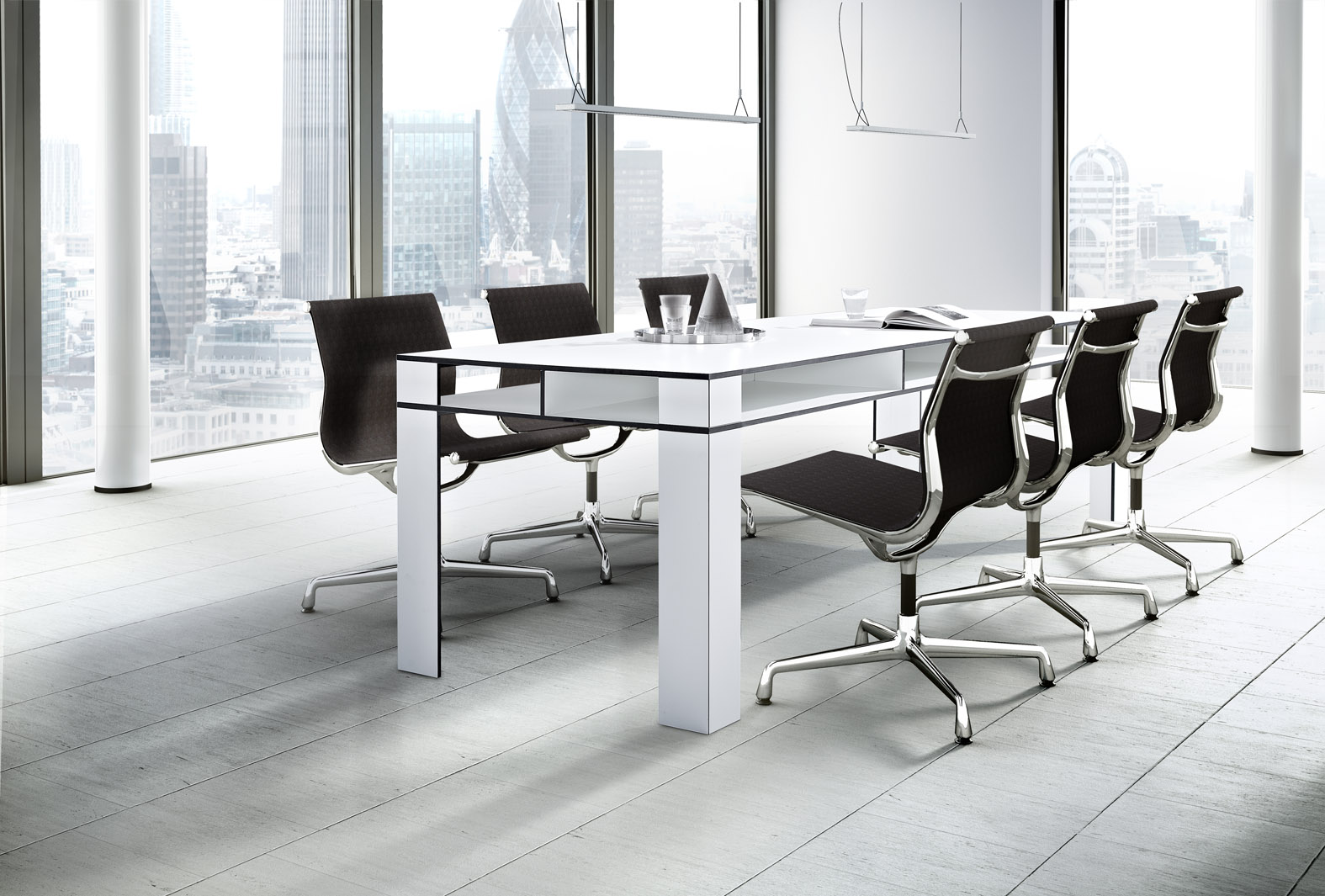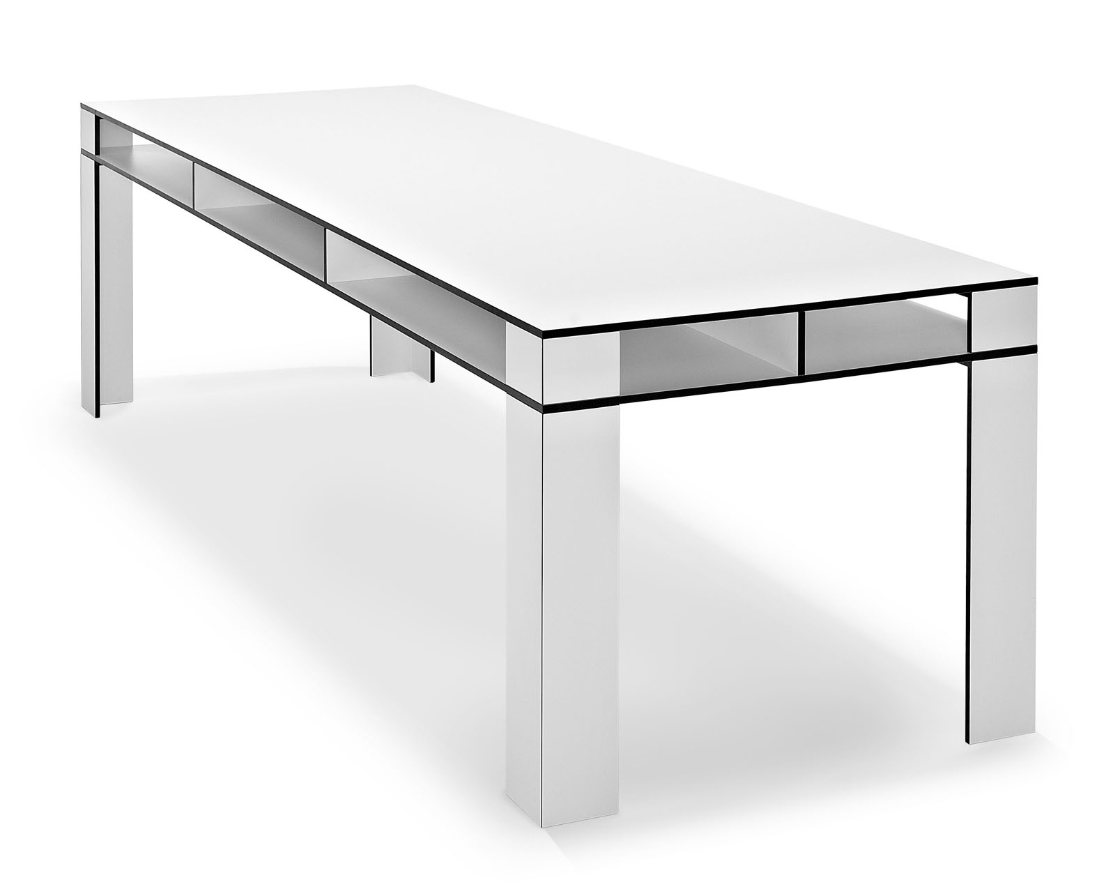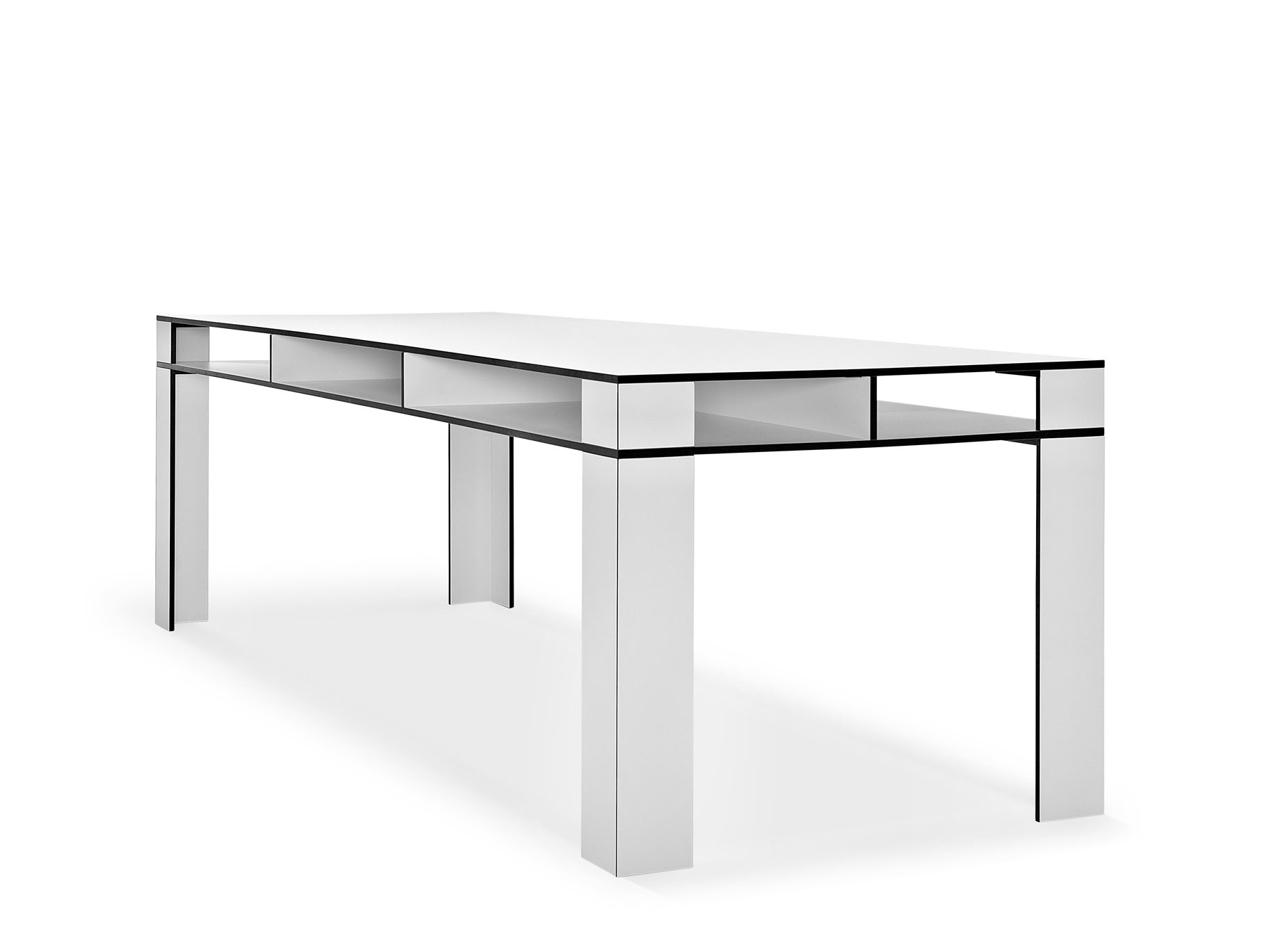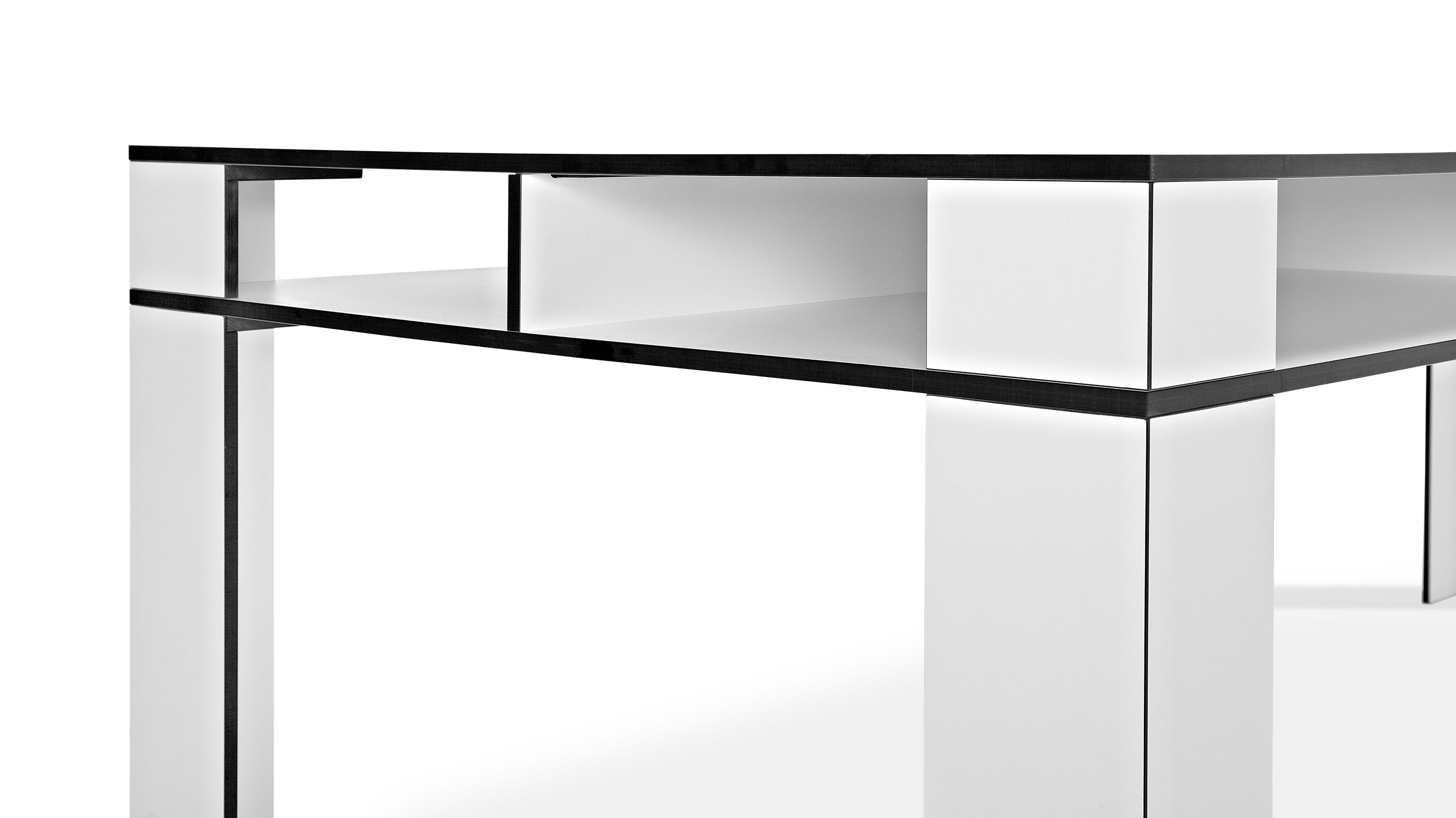 Das Design des Tisches wird durch ein ganzheitlich kräftiges Auftreten geprägt. Dieses steht bewusst im Kontrast zur minimierten Materialstärke von nur 1,3 cm. Die Kanten setzen einen starken Akzent, der sich aus dem Kontrast des Dekors und der Kernfarbe des Materials HPL ergibt (schwarzer Kern / schwarze Kante bei den Dekoren "Weiß" und "Mittelgrau", dunkelbrauner Kern / dunkelbraune Kante bei den weiteren Dekoren).