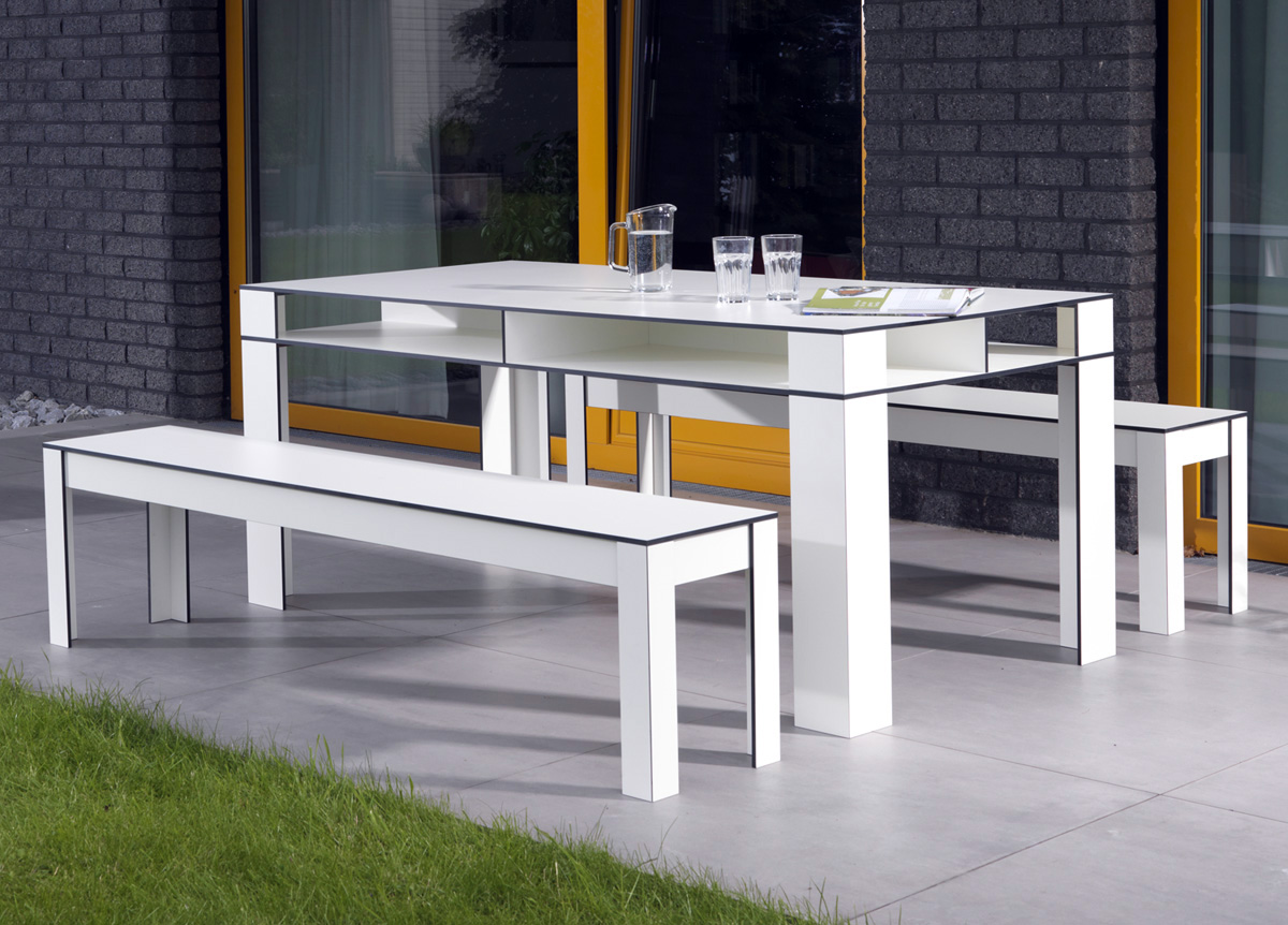 Die Design-Outdoor-Bänke sind aus dem hochwertigen Material "High Pressure Laminate" (HPL) gefertigt. Sie sind damit sehr robust, wetterfest und äußerst pflegeleicht.