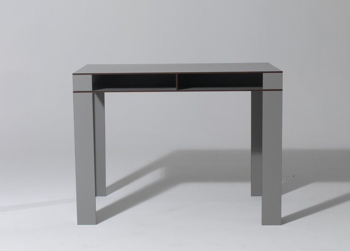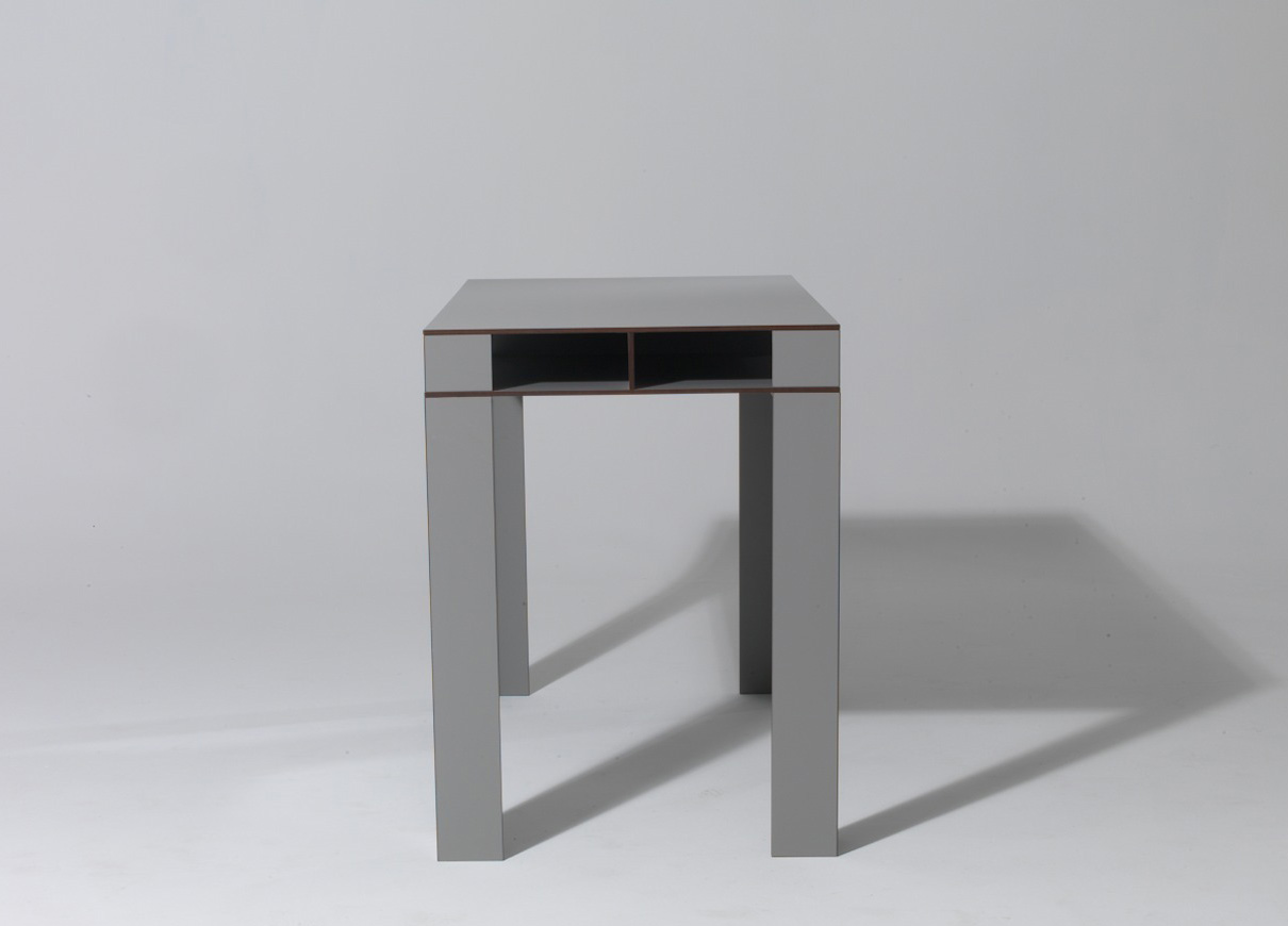 Das Bartisch-Design wird durch sehr klare und extrem dünne Linien geprägt, die sich aus dem Kontrast des Dekors und der Kernfarbe des Materials HPL ergeben (schwarzer Kern / schwarze Kante bei den Dekoren 'Weiß', 'Mittelgrau' und 'Carbongrau', dunkelbrauner Kern bei den weiteren Dekoren). Das praktische Ablagefach wird auf diesem Weg zusätzlich zu einem Design-Element.